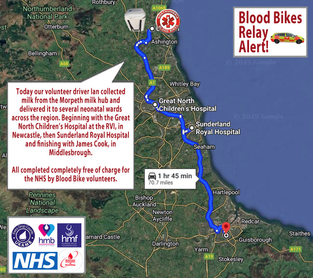 Today our volunteer driver Ian collected milk from the Morpeth milk hub and delivered it to several neonatal wards across the region. Beginning with the Great North Children’s Hospital at the RVI, in Newcastle, then Sunderland Royal Hospital and finishing with James Cook, in Middlesbrough.